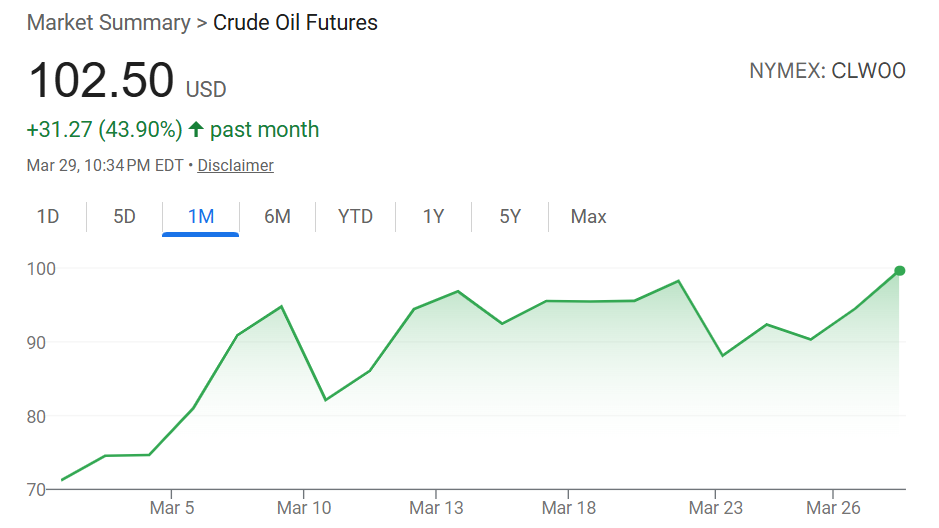 美国原油价格上涨3.5%,至每桶103.11美元,月度涨幅达53%。